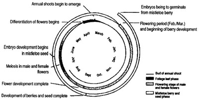 Figure 1. Annual rhythm of flower, fruit and embryo development in mistletoe growing on hardwood (Viscum album ssp. album)(11)