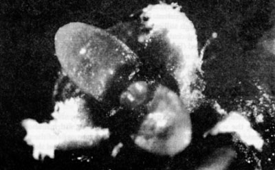 Fig. 2. Early stage of new mistletoe branch. Photograph taken 14 June 1993. Between the opened-out leaf primordia lies the central meristem which produces new, as yet undifferentiated layers of cells. The scale leaves (left foreground and right background) are blurred due to photographic enlargement (x 50).