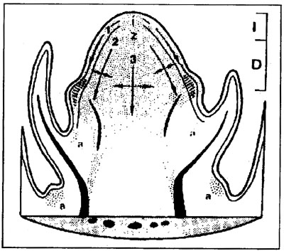 Fig. 4. Longitudinal section of shoot apex of a seed plant" I = initial zone; D = differentiation zone; i = initial apical group with central meristem cells; z = central meristem; a = axillary meristems; arrows indicate main directions of division and/or growth; 1,2,3 = stem and leaf primordia (1), bark and meristem cylinder (2) and medullary parenchyma (3); dotted areas = meristematic zones; black = vascular bundles developing in leaf primordia.