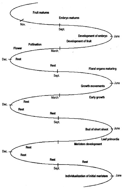 Going in reverse order from mature fruit and embryo to flower and then branch development, we found a time of about two years and two months. Following Zeller,(12) we took completion of embryonic development by about the end of September as our endpoint, the starting point being the first signs of a new generation of shoots in the leaf axils of the preceding generation, which may be seen from August onwards. Figure 1 shows this time aspect in the diagrammatic form evolved by Zeller.(12)