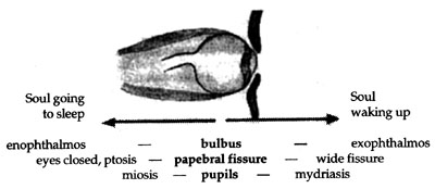Looking for the connection with human soul and spirit nature, we can feel our way by characterizing the connection between sympathetic nervous system and waking-up process on one hand and parasympathetic system and sleeping human nature on the other, though this does not do full justice to the essential nature of the autonomic system. Pupillary reactions provide a telling example. We tend to concentrate on reactions to outside light and fail to realize that the size of the pupils also reflects reactions of the inner light of soul. Pupils enlarged with shock are as much part of the waking consciousness that goes with this as is sleep, when meiosis narrows the pupils, and external light also tends to be reduced. The light and soul qualities of lightness and darkness, or the soul's awakening or going to sleep, come to expression in pupillary reactions, again showing a connection between conscious life in the senses and sympathetic quality on one hand and the soul going to sleep, seeking its night-time constellation, with parasympathetic quality on the other. This difference in the soul's reactions is also apparent in the wide open palpebral fissure of hyperthyroidism and the drooping lid of a tired or sleeping eye.