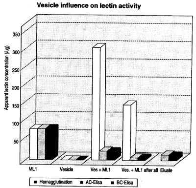 To see if the lectins are, indeed, firmly bound to the vesicles, an attempt was made to remove them by means of the usual affinity chromatography. The 4th set shows that this only proved possible to a limited extent. Following affinity chromatography, the vesicles still showed markedly elevated hemagglutination compared to the pure lectins. The ELISA readings were reduced by a further 2/3. The fifth set of bars shows that after incubation with the vesicles only 1/5 of the lectins used could be separated from the vesicles by affinity chromatography. If one also considers that cytotoxicity studies have shown that the acute cytotoxicity of lectins is reduced by about two