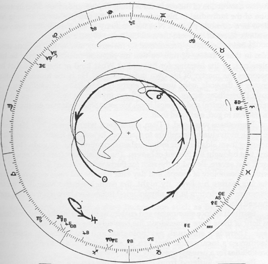 The curves inside the circle of the Zodiac indicate the gestures (including retrograde movements) of the planets in the course of Ludwig van Beethoven's gestation. The embryo is considered. geocentric. Hence, where the sun stands at the time of conception is the head, whereas the birth-sun position is at the feet.