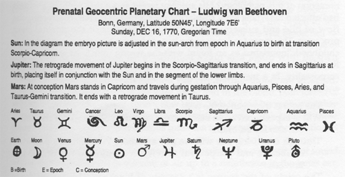 The life of Ludwig van Beethoven can be taken as a study in astrosophy in connection with the art of medicine. Following suggestions of W. O. Sucher, the gestational chart from conception to birth imprints cosmic physiological aspects on the developing embryo. A spiritual reality is pictorially represented. The movements of the planets between conception and birth become symbolic representations that express possible pathophysiological responses in the individuality. It has to be understood that many human beings born at the same time have similar charts, therefore a certain configuration of personality can be deduced. However, the ego uses these cosmic ingredients depending upon the individual's karma and makes choices out of freedom for the unfolding life task. The embryological chart can be used by the practitioner of anthroposophical medicine in the way an electrocardiogram is used by the clinician. The embryological chart could be called the "electrocardiogram of the soul."