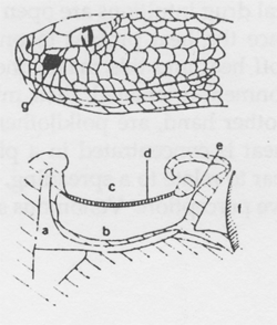 Head of pit viper showing the pit (g). Cross section through the pit of a pit viper: a) maxilla, b) inner chamber, c) outer chamber, d) membrane, e) canal