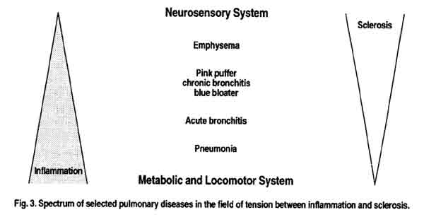 The resulting juxtaposition of inflammation and sclerosis gives us a first image for characteristic pulmonary diseases. With acute conditions such as the different types of pneumonia and acute bronchitis, inflammatory processes, i.e. the metabolic and locomotor system, preponderate (Fig. 3). The transition from acute to chronic bronchitis on the other hand involves an indeterminable tendency to sclerosis and solidification.(17) We see dyscrinism with viscous, solidified mucus. Morphologically, the typical local epithelium will often be subject to metaplasia, giving way to more resistant squamous epithelium. Stromal fibrosis develops, so that altogether one has a many- layered spectrum of hardening and sclerotic tendencies. Compared to acute pulmonary diseases the latter show a quality that belongs to the neurosensory system. The pathological processes coming under this heading may finally end in the different forms of pulmonary emphysema.