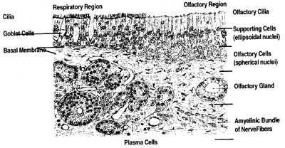 The upper respiratory tract finally seeks another orientation in morphological and functional affinity to the sensory organization. Fig. 1 provides an excellent example of the transition from the respiratory epithelium of the upper respiratory tract to the sensory epithelium of the olfactory mucosa.