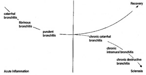 In the light of the above-mentioned qualities of inflammation, we can first of all differentiate between different forms of acute bronchitis. After purely catarrhal acute bronchitis we have the acute exudative fibrinous form with marked fibrinous exudation. This may turn into mucopurulent bronchitis at the leukocyte migration stage. If the inflammatory process overcomes the foreign quality, recovery from the bronchitis may ensue. If it does not, chronic bronchitis develops. Again it is possible to distinguish a number of forms that differ in quality. The first one to consider is chronic catarrhal bronchitis. This form, which is still superficial, may qualitatively continue on into intramural chronic bronchitis. The most severe form of the disease is chronic destructive bronchitis with transition to emphysema.(17)