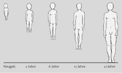 Fig. 1a: Metamorphosis of the human body shape, with the transition from nerve-sense dominance to increasing limb-development. The maximum manifestation of diabetes type 1—between age 14 and 20—coincides with most intense limb development. (From: Husemann A. Der musikalische Bau des Menschen. Entwurf einer plastisch-musikalischen Menschenkunde. Verlag Freies Geistesleben, 2nd Edition 1989)
