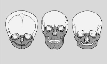 Being a sense-organ also means that the child’s being still lives completely in its surroundings, in the periphery, and only gradually masters the inner world of its body. Much as embryonic development proceeds from the periphery of the developing embryo, which is only gradually taken hold of in the various processes of invagination, a similar gesture prevails on the functional plane in childhood, moving from the periphery towards increasingly autonomous existence. “When the child is quite young, all development proceeds from the head. When the change of teeth is over..., then all development comes from the chest. ... And only when the human being has become sexually mature does development proceed from the whole human being, from the limbs” (11: Rudolf Steiner’s lecture for the workers at the Goetheanum). Of course this infantile preponderance of the head organization does not imply a dominance of the forces of consciousness. At this stage these forces still must remain asleep, to awaken only much later. What we are speaking of are the formative life forces, which in the infantile organism unfold primarily in the head and sensory organization, removed from consciousness, and take hold of the rest of the body only in the further course of development. It is the path from a sensory system open to the periphery, to the development of an interior bodily space. The emanation of development from the head organization is vividly manifested in the changes of bodily form from childhood to adulthood (fig.1a). The increasing formation of the limb organization is easily recognized, and a corresponding gesture can be read in the formative metamorphosis of the skull: Initially, development of the neurocranium dominates, with a small facial skull and a narrow limb area of the maxilla and (primarily) the mandibles. Then there is more intense development of this limb-related organization (fig.1b), which recedes again in later life, particularly in the phase of old age. This formative metamorphosis quite visibly reflects the path of incarnation and excarnation of the spiritual individuality, becoming the outward gesture of an inner, spiritual process.