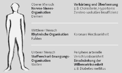 What picture can be developed of metabolic syndrome? To begin with one can contemplate the phenomenon of insulin resistance. When this is present, more insulin is needed on target tissue in order to achieve an insulin action than on non-insulin-resistant tissue. Applied to glucose, insulin resistance can be interpreted as a glucose absorption disorder. In addition to the liver and sites such as the fatty tissue, this phenomenon is encountered in the skeletal musculature of the human being, i.e. in the movement organization. This in itself makes it possible to link a discussion of metabolic syndrome to inner aspects of the human being. What are the peculiarities of the will, which creates an instrument for itself in the movement organization; and what is the significance of movement in which the will expresses itself? Here it is of special interest to note that insulin sensitivity can be markedly improved by movement. In a monitored movement program, a significant decrease in insulin resistance was evidenced. Furthermore it could be “very convincingly demonstrated that regular physical training can in fact prevent later occurrence of type 2 diabetes” (23). If, in describing this syndrome, our attention turns to the inner human being, the following picture of metabolic syndrome may result: