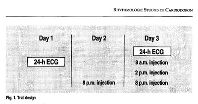 3 On the third day, the second 24-hour ECG started at 8 a.m., with the second Cardiodoron 5% injection in the same dosage given at the same time. The injection was repeated at 2 p.m. and 8 p.m.