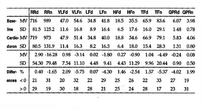 Table: Mean values (MV) and standard deviations (SD) of baseline and Cardiodoron recordings for all subjects and Careffodoron-baseline differences (in ms, except for QPR). See also text.