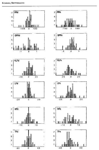 The histograms of Fig. 2 confirm that first impression. Distribution of differences between Cardiodoron and baseline readings show a remarkably high incidence of negative values especially for very low-frequency heart period variability at night (VLFn). Daytime differences are more around zero, with differences less marked than at night. This is due to the fact that variability is naturally less during the day than at night, so the differences between daytime readings are also smaller.