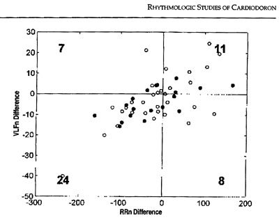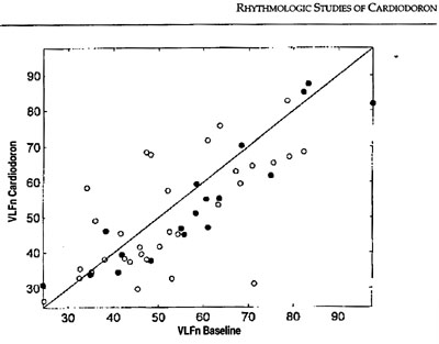 Fig. 3 shows mean baseline VLFn variability plotted against the corresponding Cardiodoron readings. Dots below the 45 degree line indicate a drop, those above a rise in VLFn. The graph shows no dependence of VLFn changes following exhibition of Cardiodoron on the initial VLFn reading. Nor is there a gender-dependence. These results are representative of all other parameters.