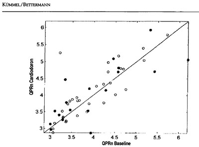Fig. 4. QPRn baseline v. Cardiodoron. Circles = female subjects, dots = male subjects. Note increased number of minor increases independent of initial baseline reading (no normalization).