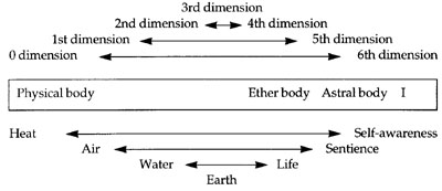 Brief consideration may be given to yet further dimensions referred to by Rudolf Steiner.(13) We reach the 4th dimension by overcoming the 3rd, the 5th by overcoming the 2nd, and the 6th by overcoming the 1st. Thus, a total of 7 dimensions has real significance: