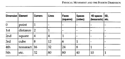 The table helps us to check that we are still working in an entirely logical sequence when we seek to get a notion of the cube's big brother in the 4th dimension. It shows the total number of comers, edges, sides, etc. for the bodies we have so far discussed.