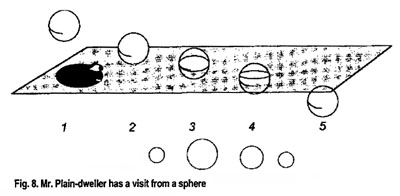 The law is not as easily applied to the 4th dimension as in the case of the cube. Let us use another method therefore. We have already met our friend, Mr. Plain-dweller. A shadow of himself, he lives entirely in the plane and has no notion of our 3-dimensional space. One day, the sphere with its 1-cm radius comes to visit him. It touches down on his plane, and he perceives it to be a point. The sphere is able to pass through his plane, which has no thickness. Mr. Plain-dweller is greatly surprised but only able to perceive the slice of the sphere created by intersection with the plane at any given moment.