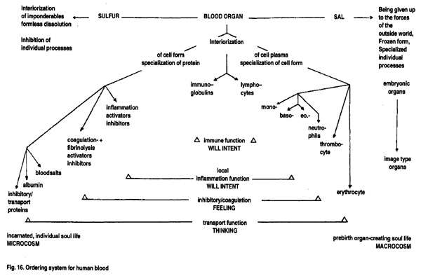 In this ordering system both individual and macrocosmic prebirth activity shine out in thinking, feeling and will intent. We thus discover the threefold order of the blood, which reveals the Sal - Mercury - Sulfur forces with their configuring and process-ordering activities. The twofold order of the blood between the more embryonic, live lymph system and the image organs which develop through a sequence of metamorphoses, showed relationship to past and future.