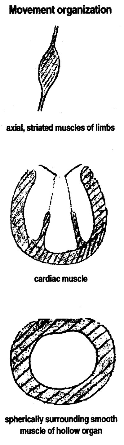 Striated muscles capable of voluntary innervation are essentially represented in the extremities. Their movements can be structured by visualizing an action and with intentions which encompass the purpose of the action as we have it in our thoughts. The soul gives expression to will intent, seeking to come close to the world of thoughts and ideas, i.e. waking consciousness. The thought-determined motive, a phenomenon of waking consciousness, is brought to realization in purposeful action in a movement that is shrouded in unconsciousness. If, on the other hand, we consider the smooth muscle found in the hollow organs of the human organism, for instance, it is still possible to see a connection with soul life, but no more voluntary innervation. The movement organization has therefore left its immediate vicinity to the waking conscious sphere of the soul in turning to the metabolic organization which is essentially shrouded in a level of consciousness that is close to sleep.