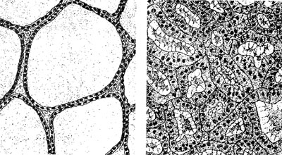 Fig. 3. Histology of thyroid relative to its function. Left: inactive gland with flat follicular epithelium and dominance of the fluid organism (colloidal material). Right: active gland with highly prismatic follicular epithelium and dominance of colloid mobilization5 (With kind permission)